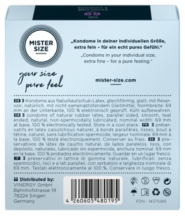 Przezroczyste, cienkie prezerwatywy Mister Size (69 mm) wykonane z naturalnej gumy lateksowej z powłoką nawilżającą i zbiorniczkiem. Wegańskie.