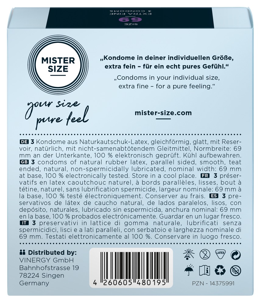 Transparent, extremely thin Mister Size condoms (69 mm) made out of natural rubber latex. The condoms are covered in lubricant and are teat-ended. Vegan.