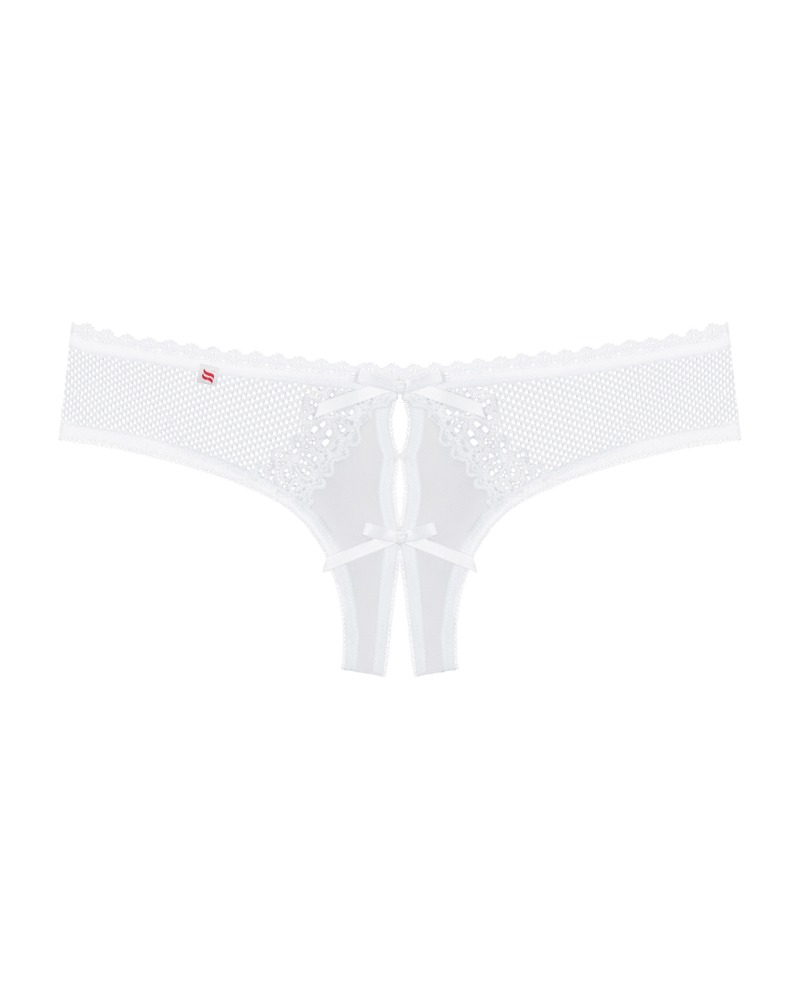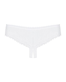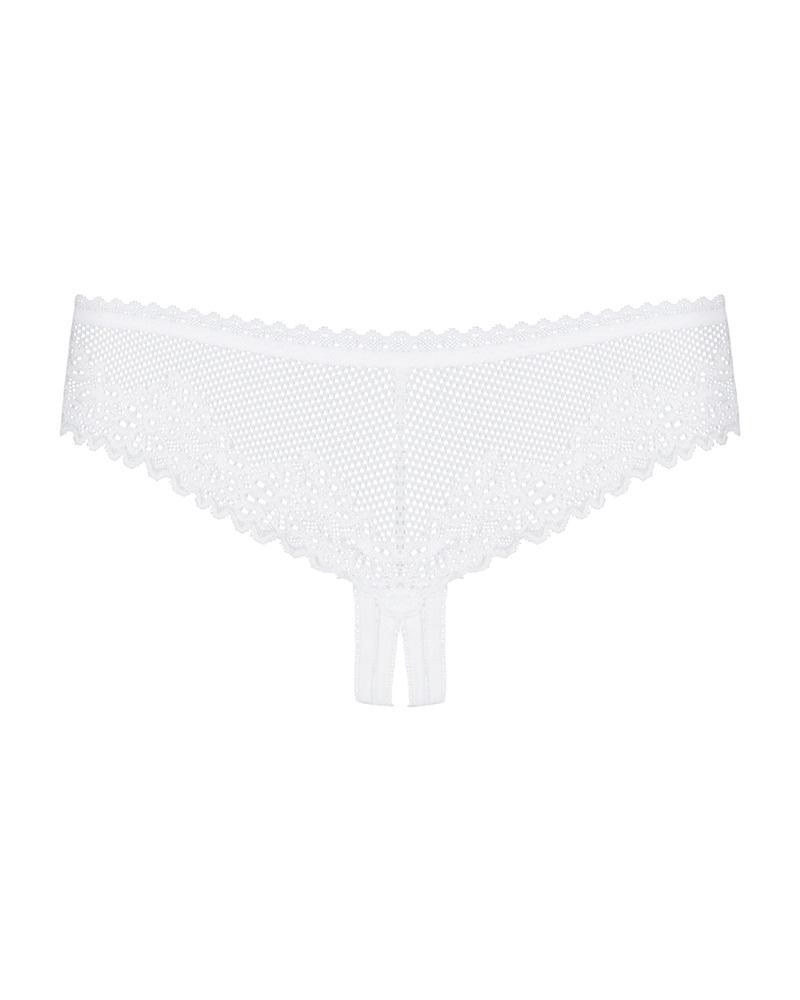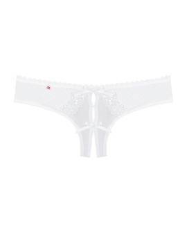 Hvit/gjennomsiktig strengtruse Alabastra fra Obsessive med fransk åpning. I delikat tyll, finmasket netting og søt blonde. Behagelig mykt og elastisk stoff. Det åpne skrittet er pyntet med satengsløyfe foran.