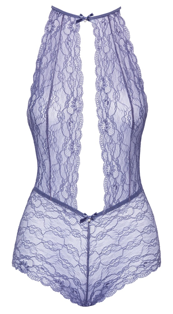 Body de kissable completamente hecho de fino encaje. Muy generosamente recortado en la parte delantera y trasera. Suave y elástico en todo su contorno para una mayor comodidad de uso. Cuello y cintura con lazo y adorno de piedras brillantes, cinta de cuello con pequeño cierre de gancho en el cuello.