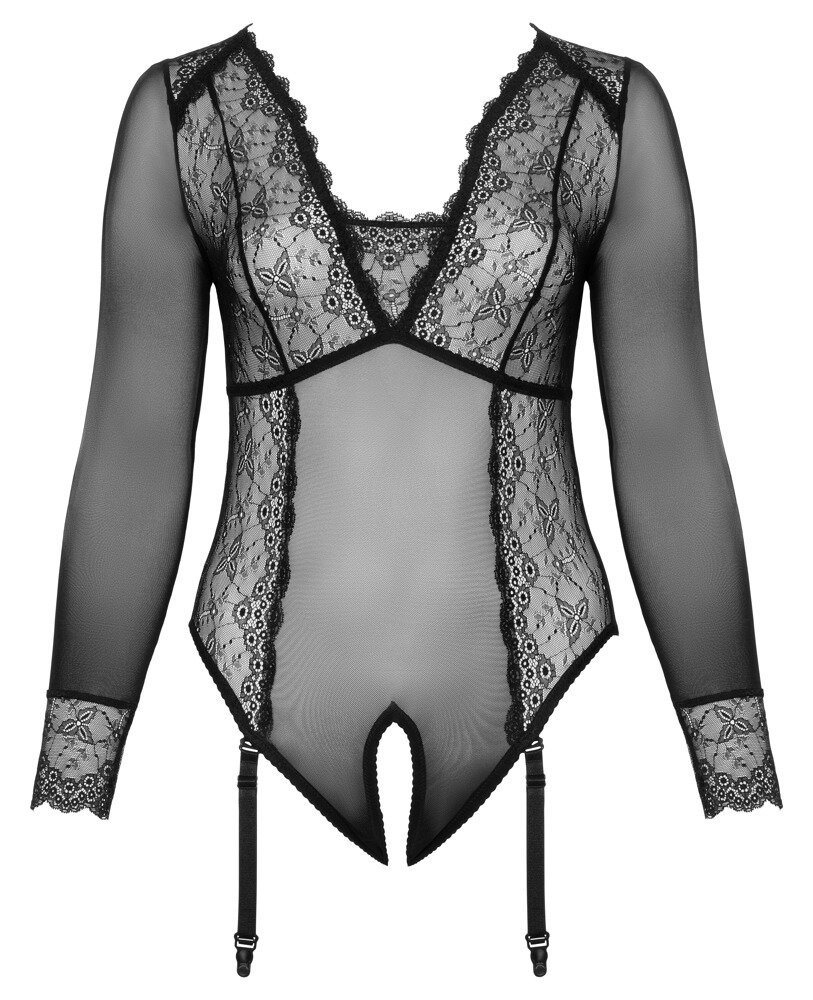 Black-transparent, crotchless and long-sleeved body from Cottelli CURVES made of fine powernet with inserts in delicate lace. Extremely stretchy and soft to the touch for a close fit and maximum comfort. Large cut-out at the back, clip fastening at the back of the neck. Featuring a crotchless design up to above the bottom. The two suspenders at the front are adjustable and also completely detachable.