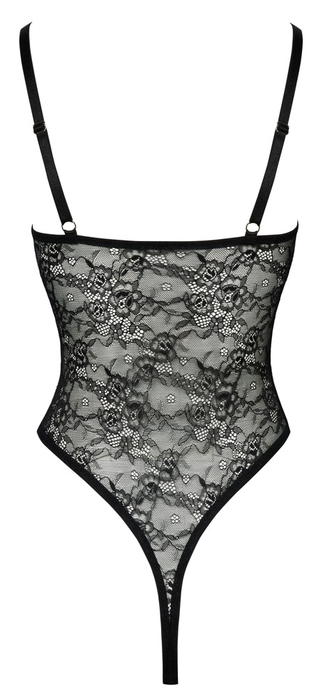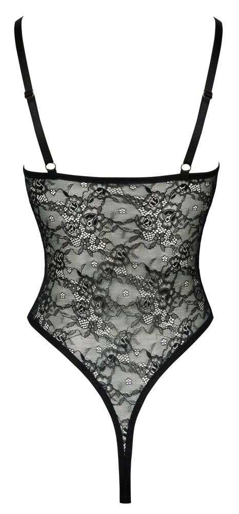 Cottelli LINGERIE crotchless body made from fine black floral lace that feels soft and stretchy. With stylish, elasticated shoulder straps and decorative silver-coloured rings in the cleavage area. The straps can be adjusted to fit. Extra high leg cut-outs show off the bum and legs to their best advantage. Seductively open over the mons veneris and at the crotch.