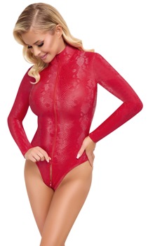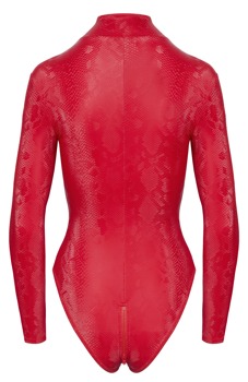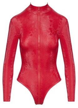 Hudtæt body fra Cottelli PARTY i et trendy rødt slangeskindslook. Med lange ærmer og en høj ståkrave. Blød og elastisk for høj bærekomfort. Den 3-vejs lynlås, som går fra ståkraven gennem skridtet til over balderne, er både praktisk og erotisk - den kan åbnes og lukkes på mange forskellige måder.