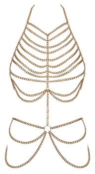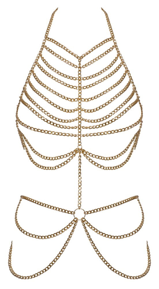 Guldfärgad kroppskedja från Cottelli ACCESSOIRES i tvådelad look. Med påkostad kedjebesättning över brösten och höfterna framtill. Individuellt justerbar och anpassningsbar i nacken och öppen rygg med totalt 3 karbinhakar. Oavsett om de används enskilt som underkläder för en erotisk look eller snyggt kombinerade med badkläder och tajta outfits - dessa glamorösa kroppssmycken är alltid en läcker syn!