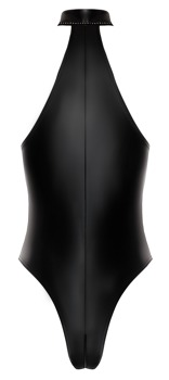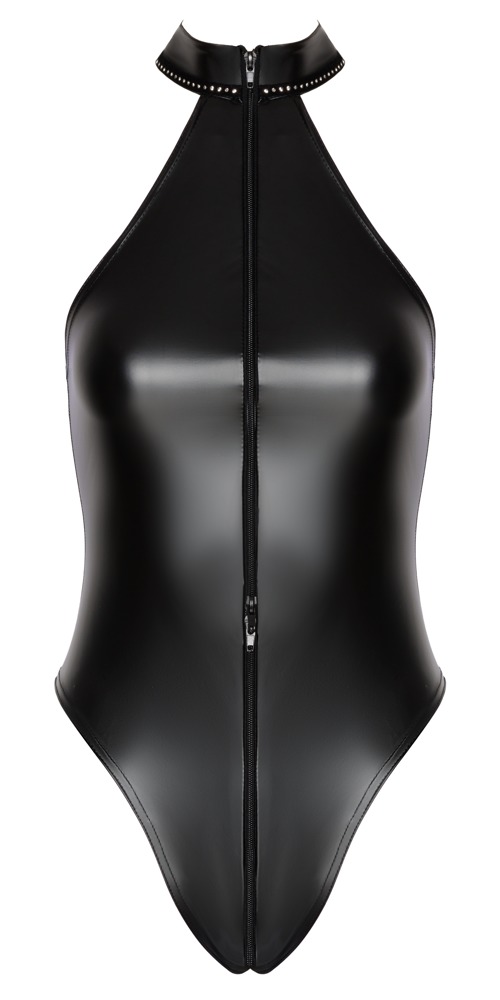 Fremhevende bodyfra Noir i svart powerwetlook som legger seg inntil huden som en andrehud. Det myke, elastiske stoffet føles deilig mot huden og bodien er behagelig å ha på. Smalt skåret fasong med glitrende strass på ståkragen. Gjennomgående 2-veis glidelås foran fra krage til skritt og over baken. Den ekstra høye benskjæringen fremhever bena.