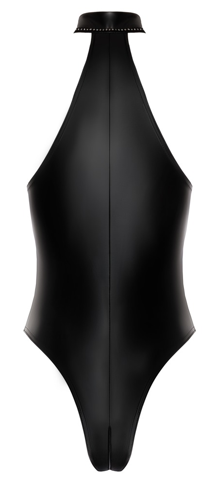 Betonande body från Noir i svart powerwetlook - sitter som en andra hud. Mjuk och elastisk för maximal komfort. Knappt skuren style med bara axlar och glitttrande strass på ståkragen. Den genomgående 2-vägs-dragkedjan går från kragen genom grenen till rumpan. Extra höga benskärningar presenterar rumpa och ben på bästa sätt.