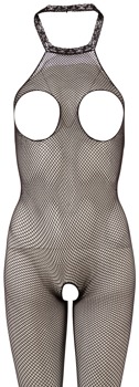 Streichelweicher Catsuit ouvert von NO:XQSE aus schwarzem Netz. Rückenfrei – elastischer Neckholder aus Spitze. Mit Cut-outs für die Brüste und im Schritt. Nahtlos gefertigt und elastisch für hohen Tragekomfort.