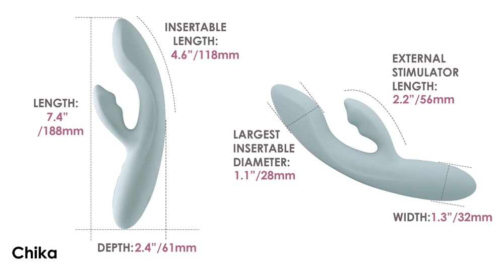 Chika är tillverkad av mjukt Liquid Silicone och är behagligt fast men ändå flexibel. Den anpassar sig perfekt till din kropp och dina rörelser. Med sin ultramjuka yta är den lätt att föra in och ger fullständig komfort när du tillfredsställer dig själv.