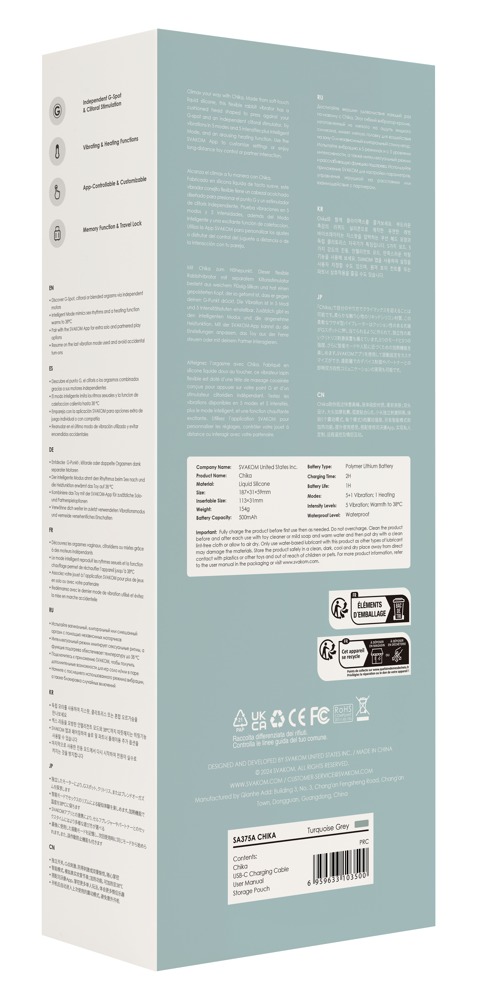 6 vibrationsmodus i 5 olika intensiteter ger mycket variation. Även den extra SVAKOM Intelligent-modusen, som imiterar en riktig sexrytm. Värmefunktionen upp till 38°C tar vibratorn just till den rätta drift- och kroppstemperaturen. Minnesfunktionen kommer ihåg den senast använda vibrationsmodusen när du stänger av den. Det praktiska knapplåset säkerställer också en diskret transport och förvaring.