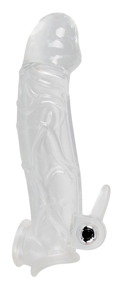 Transparente Penishülle Penis sleeve with extension and vibration von Crystal Clear mit massiver Eichel und markanter Äderung, die den Penis verdickt und um 5 cm verlängert. Die integrierte Hodenmanschette sorgt für einen sicheren Sitz und ein angenehm zupackendes Gefühl. Mit Klitorisreizer inklusive herausnehmbaren Vibrobullet. Inklusive Batterien.