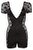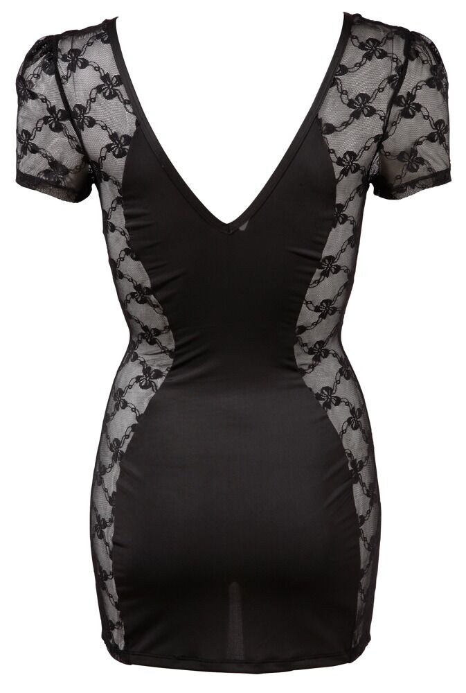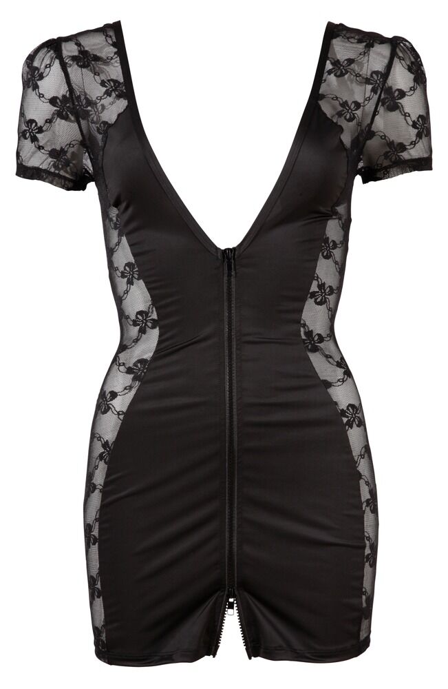 Stram, sort-transparent minikjole med fine blonder i siderne. Med korte ærmer, dyb udskæring foran og bagpå samt 2-vejs-lynlås i fronten. Sort.