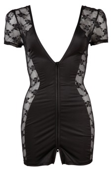 Obcisła, prześwitująca sukienka bieliźniana, po bokach wykonana z delikatnej koronki. Z krótkimi rękawami oraz głębokim dekoltem z przodu i z tyłu. Dwukierunkowy zamek błyskawiczny z przodu sprawia, że seksowny wygląd jest perfekcyjny.
