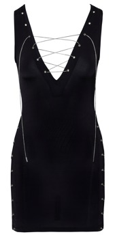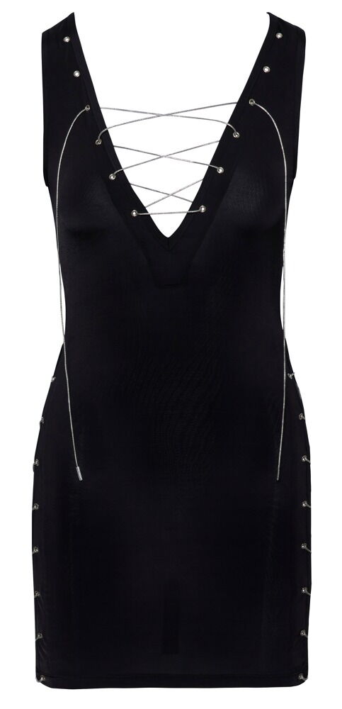 Kort, tajt klänning i semigenomskinligt svart med lätt glans. Mjuk och elastisk för maximal komfort. I den djupa V-ringningen fram och på vardera sidan av kjolen befinner sig skimrande öglor med silverfärgade snören. Snörningen kan anpassas individuellt.