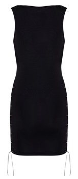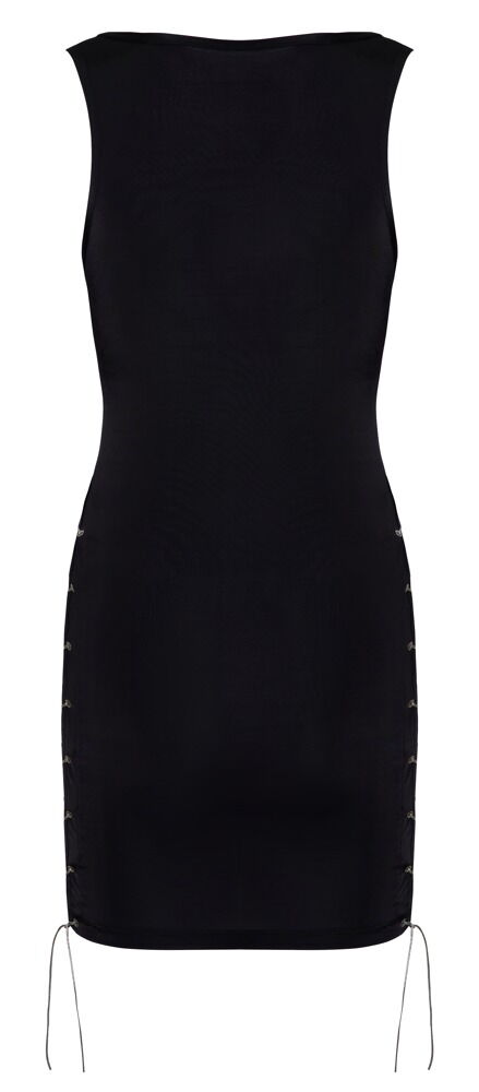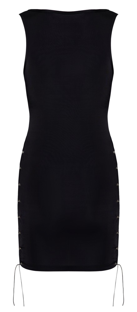 Short, tight dress in semi-transparent black with a light elegant gloss. Soft and stretchy all around for a high wearing comfort. The plunging V-neckline at the front and each side of the skirt have iridescent silver eyelets with a silver-coloured cord for an exciting lacing that can be adjusted.