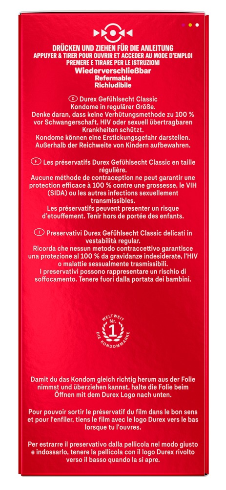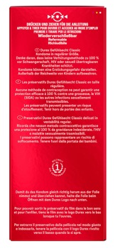 Préservatifs transparents Gefühlsecht Classic de Durex en latex de caoutchouc naturel avec enduction humide à base de silicone. Par rapport aux préservatifs cylindriques traditionnels, la forme anatomique innovante Easy-on des préservatifs Durex offre un peu plus de place aux bons endroits et garantit ainsi une mise en place et un déroulement plus faciles ainsi qu'une assise confortable et des sensations intenses.