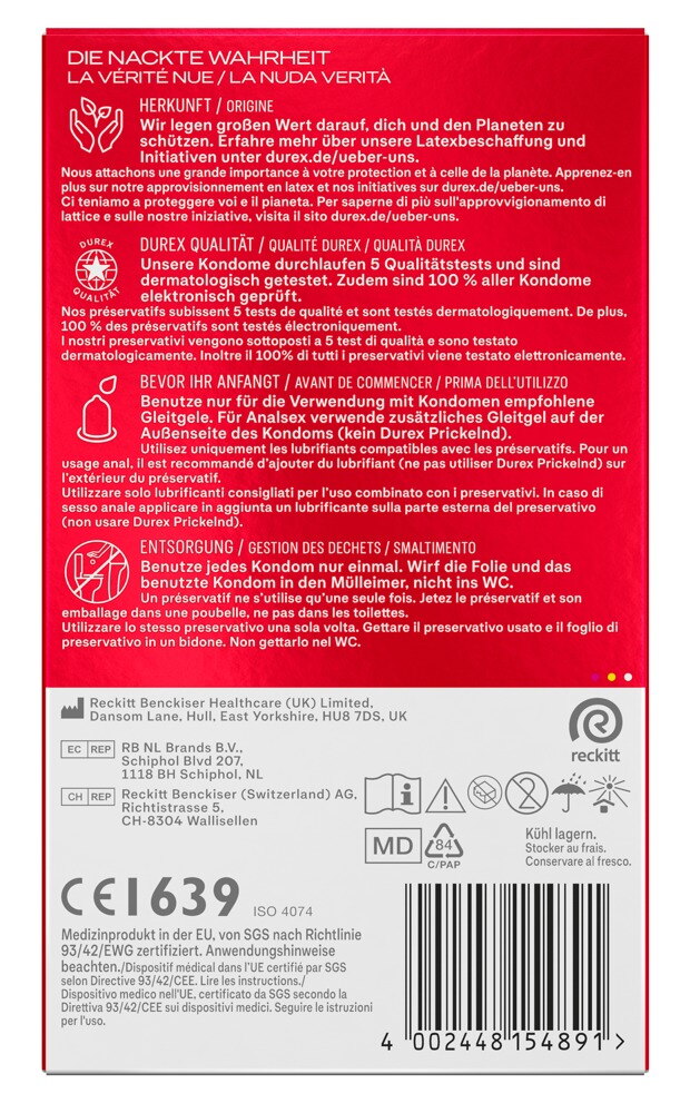 Transparente Kondome Gefühlsecht Classic von Durex aus Naturkautschuklatex mit Feuchtbeschichtung auf Silikonbasis. Im Vergleich zu herkömmlichen zylindrischen Kondomen bietet die innovative anatomische Easy-on-Form der Durex-Kondome an den richtigen Stellen etwas mehr Platz und gewährleistet so ein leichteres Anlegen und Abrollen sowie komfortablen Sitz und intensives Empfinden.