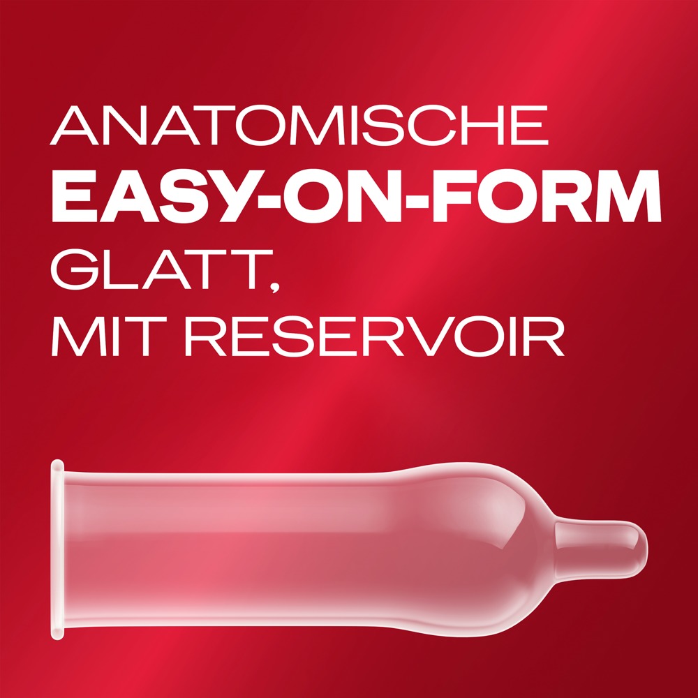 Contoured, transparent condoms with an easy-on shape for a perfect fit. The condoms can also be rolled down easily. Safety thanks to its teat-end and lubrication.