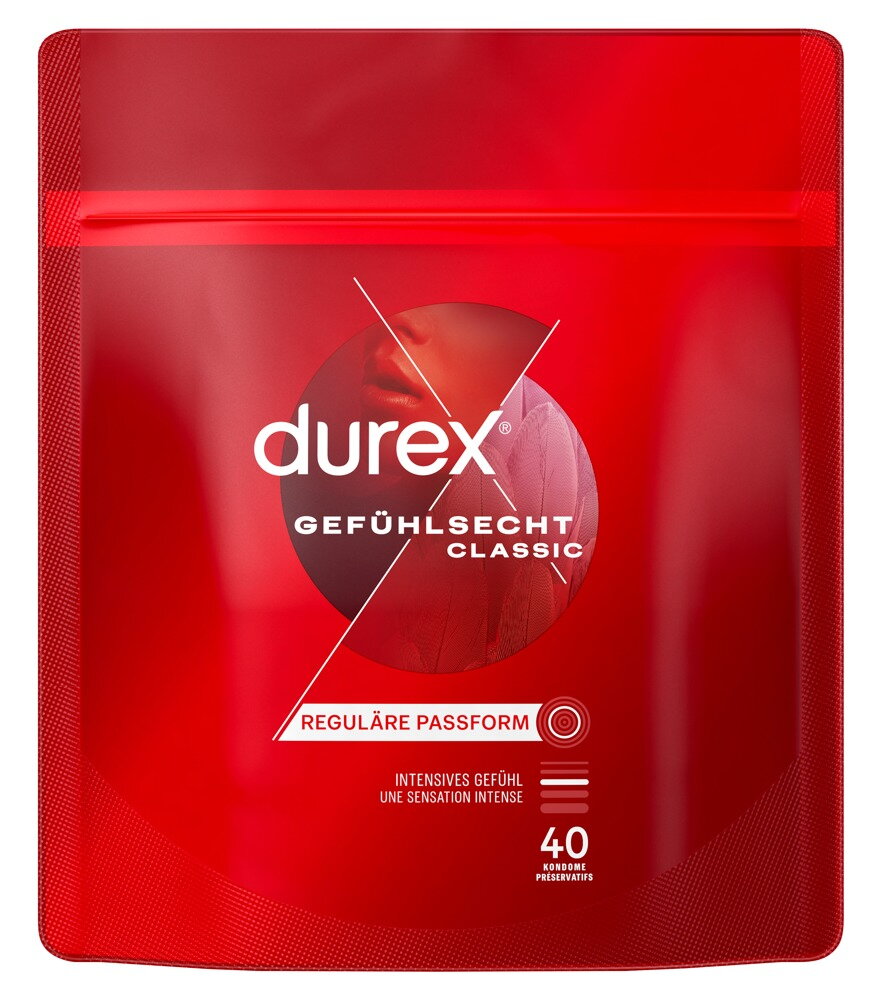 Préservatifs transparents Gefühlsecht Classic de Durex en latex de caoutchouc naturel avec enduction humide à base de silicone. Par rapport aux préservatifs cylindriques traditionnels, la forme anatomique innovante Easy-on des préservatifs Durex offre un peu plus de place aux bons endroits et garantit ainsi une mise en place et un déroulement plus faciles ainsi qu'une assise confortable et des sensations intenses.