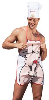 Fräckt förkläde med bild av en naken man. En läcker syn som nog ska väcka aptiten på annat än mat...