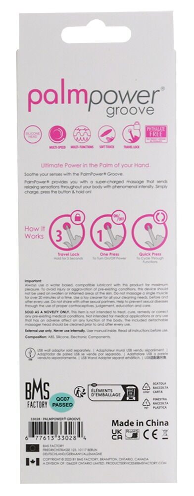 Lille, handy massagestav groove fra palmpower til helkropsmassage og målrettet stimulering af nydelsespunkter - hjemme eller på farten, alene eller som par. Det store, fleksible silikone-massagehoved med udprægede stimuleringsriller når selv svært tilgængelige områder af kroppen. 4 vibrationshastigheder og 3 intense rytmer giver forskellige former for nydelse og kan nemt styres direkte på legetøjet med et tryk på en knap.