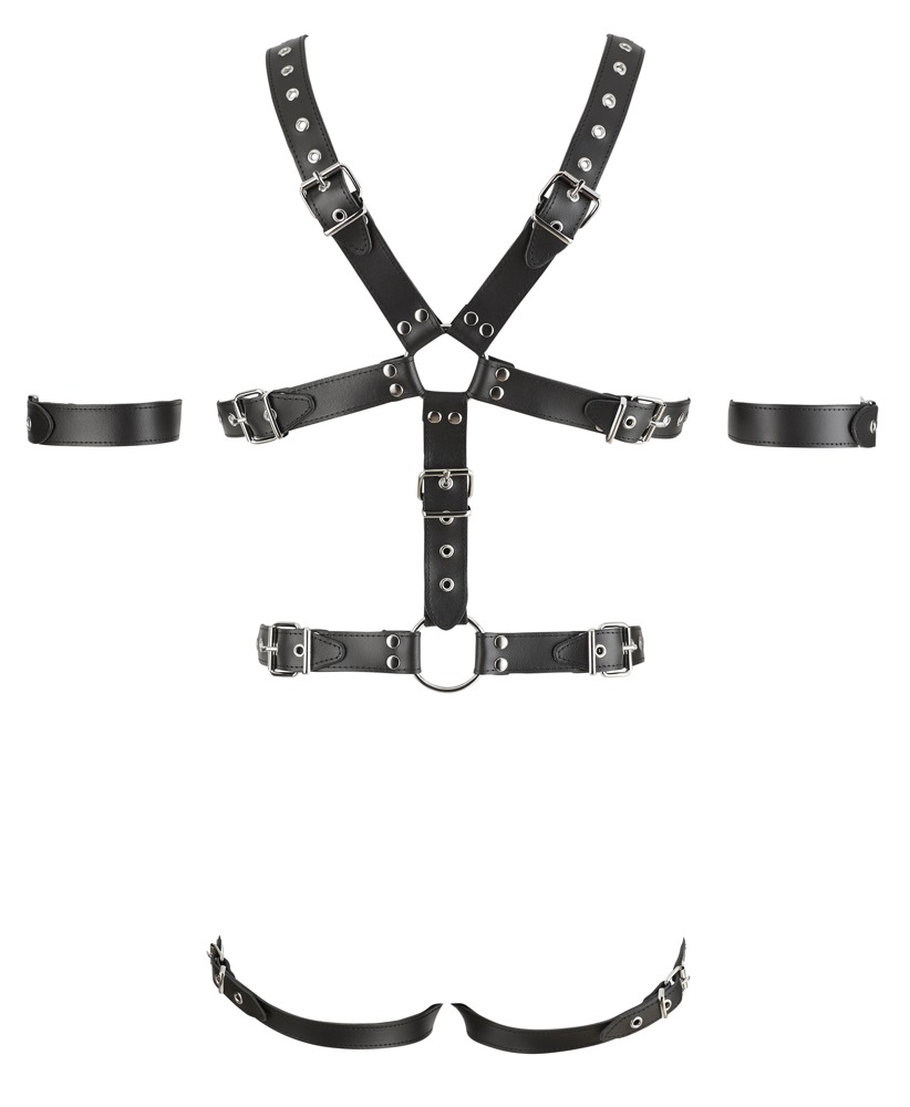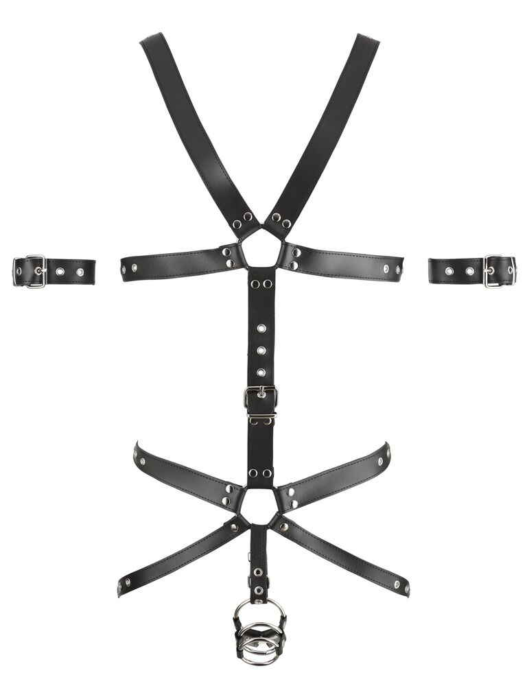 Robuster Einteiler mit verstellbaren Leder-Riemen und 3 Metall-Ringen für Penis und Hoden. Setzt männliche Vorzüge in Szene und sorgt für extra Stehvermögen.