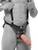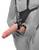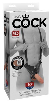 Avtagbar penisdildo på en justerbar, svart komfort-harness med hängslen. Den är ihålig så att penisen kan föras in. Ollon med liten öppning.