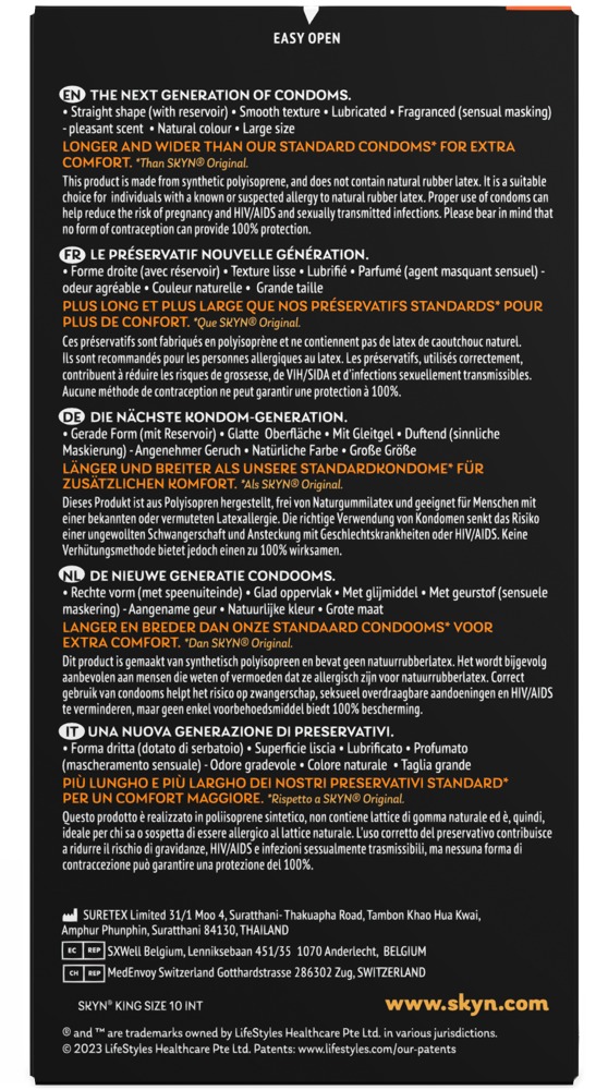 Los preservativos transparentes, húmedos y ultrafinos Manix SKYN King Size son extragrandes, con una longitud de 190 mm (normalmente 180 mm) y una anchura nominal de 56 mm (normalmente 52 mm). El material de poliisopreno de los preservativos se denomina Skynfeel y es más suave y elástico que el látex, pero igual de estable y sin el clásico olor a látex. Por lo tanto, es ideal para las personas alérgicas al látex. Vegano.