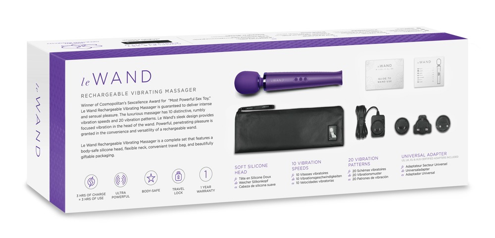 The le wand massage wand has a large, flexible massage head that is made out of silicone. It provides sensual moments of pleasure with its 20 vibration modes and 10 intensities. It can be easily controlled at the push of a button. With a practical travel lock. Rechargeable with the included USB cable. Includes a storage bag.