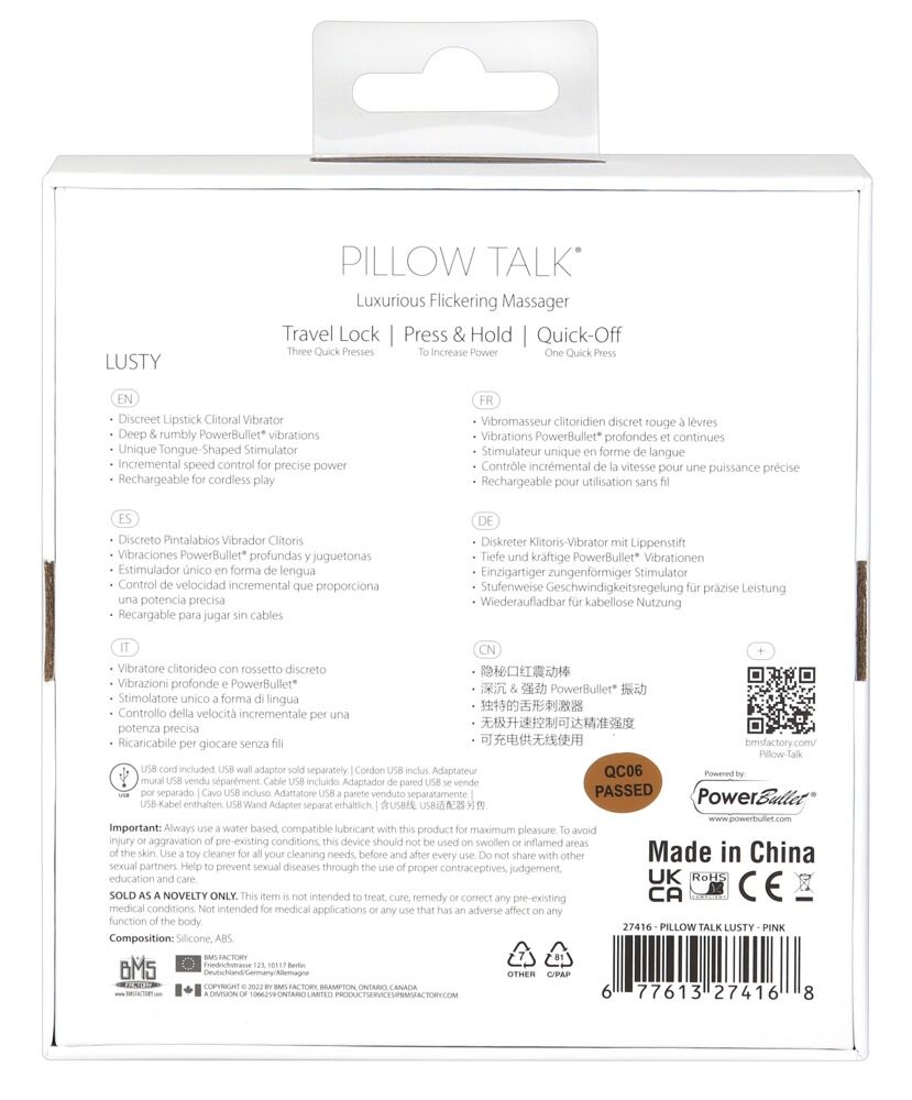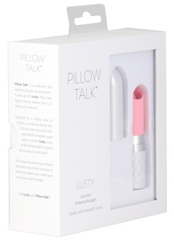 Minivibratorn Lusty från Pillow Talk i en ädel läppstiftsdesign och med Swarovski-smyckesten. I den öppna spetsen vibrerar en fladdrande tunga, perfekt för direkt stimulation av t ex klitoris, bröstvårtor, pung, mellangård etc. Vibrationen styrs steglöst via knapptryck. Med skyddslock.