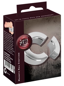 Silver-coloured cock ring/ball stretcher made out of stainless steel. With a magnetic piece to open and close the ring. Inner Ø: 34 mm. Outer Ø: 63 mm. Thickness: 20 mm. Weight: 341 g. Metal.
