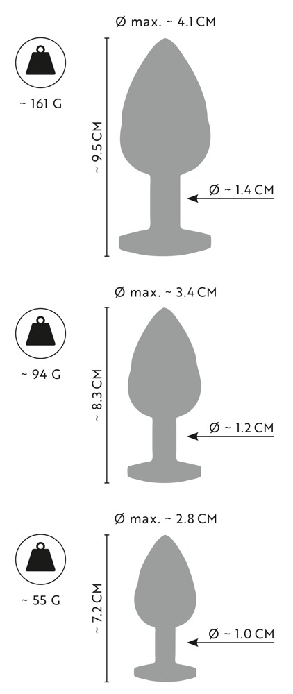 The Metal Butt Plug Set with Diamonds from ANOS has 3 metal plugs in different sizes and weights. For anal stimulation and perfect stretching training. Each plug has a different coloured sparkly gem on the anal-safe stopper for decorating the anus. The metal plugs have spiral grooves all around them and they can also be warmed up or cooled down for stimulating temperature play as well.