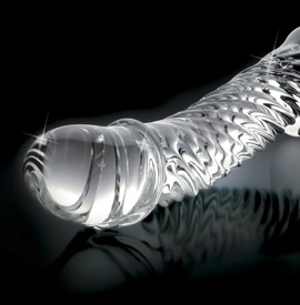 Eksklusiv, håndlaget glassdildo med pirrestrukturert skaft, hodeformet tupp og solid base. Dildoen kan oppvarmes i varmt vann eller avkjøles med kaldt vann - begge deler en lystnytelse. Glasset er uten skjøter og dildoen er hypoallergen.