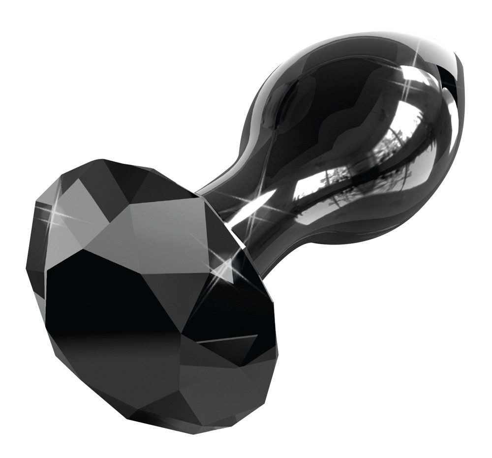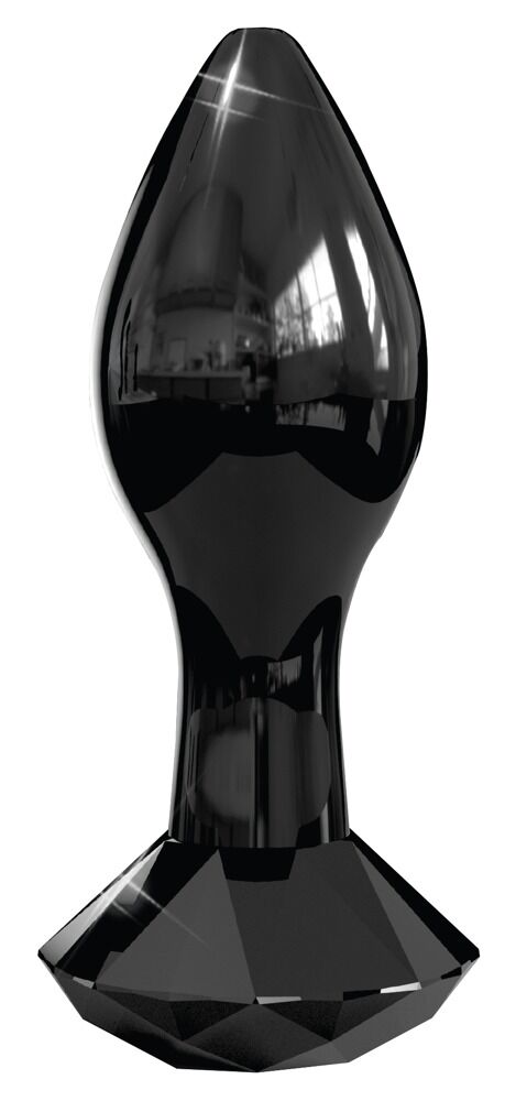Kägelformad svart analplugg av munblåst glas med stoppare i form av en smyckessten i diamantdesign. Doftneutral, antiallergen och väldigt hygienisk eftersom den är enkel att göra ren, t o m i diskmaskinen. Tips: värm upp den i vattenbad eller kyl ner den i kylskåp innan, så ökar du njutningen ännu mer. Vid god skötsel håller produkten hela livet. Total längd: 9 cm, införingsdjup: 6 cm, Ø 3 cm. Material: glas.