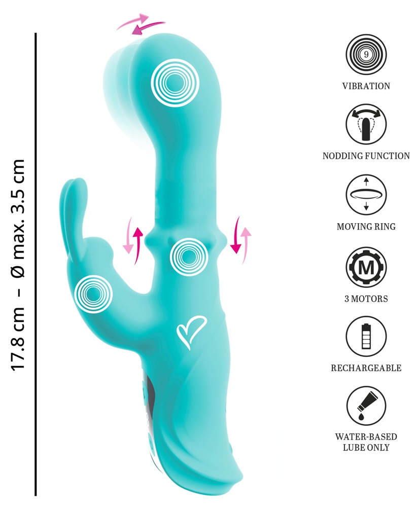 Trois moteurs puissants et silencieux offrent une puissance fiable pour les fonctions puissantes. Les vibrations dans la tête et le clitoris Bunny ainsi que la fonction Nodding combinée avec le massage Slide Ring (tige) peuvent être commandés séparément dans 9 modes. Très confortablement, en appuyant sur un bouton. L'affichage LED intelligent permet de contrôler les modes de manière idéale.