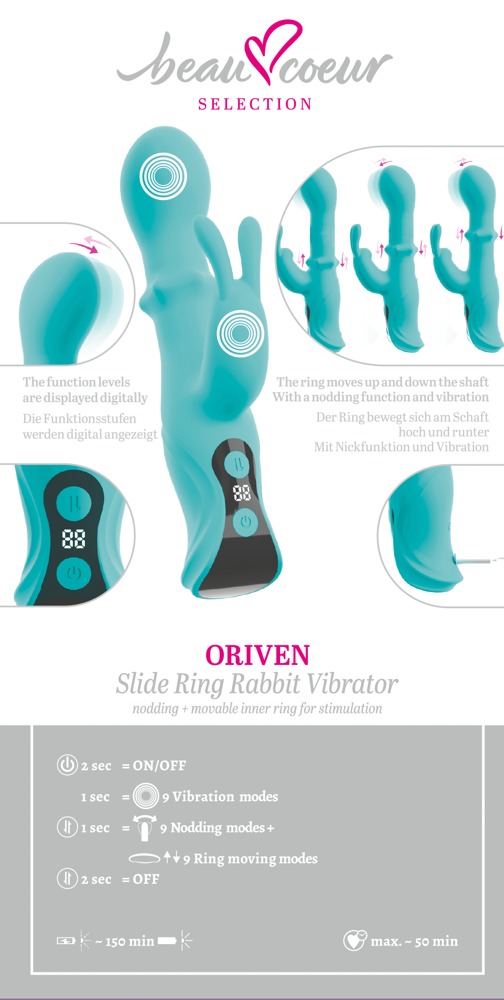 Den energiske ORIVEN Slide Ring Rabbit Vibrator fra beau cœur forkæler indvendigt og udvendigt på samme tid. Og ikke kun med kraftige vibrationer specielt til G-zonen og klitoris. Den masserer også vagina intensivt med sit dynamiske nikkehoved (nodding) og kugleringen (slide ring) i skaftet, der glider op og ned på samme tid. Dobbeltstimulation på et nyt niveau for unikke nydelsesoplevelser – og klimaks!