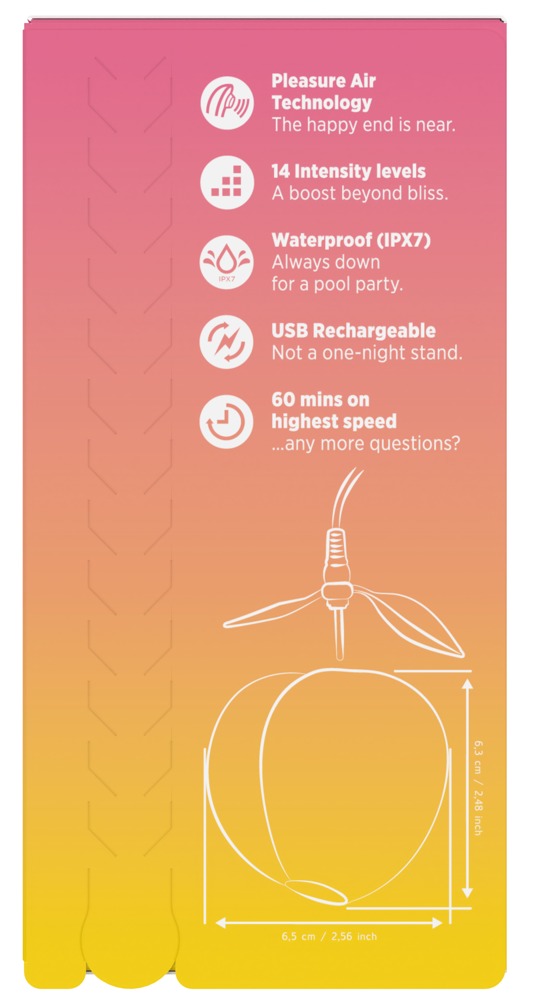 Fremstillet af silkeagtig blødt silikone, smigrer Peach-pulsatoren ikke kun klitoris, men også alle andre ydre lystpunkter. Håndterlig og nem at betjene, kan den legende inddrages i enhver solo- og parleg – derhjemme og på farten.