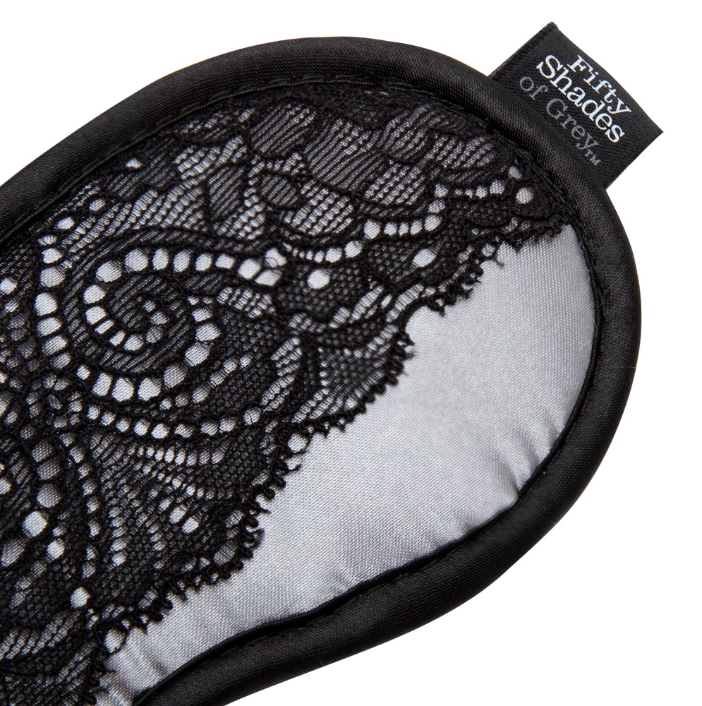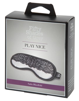 Elegant Play Nice Satijnen Blinddoek oogmasker van Fifty Shades of Grey gemaakt van zilverkleurig satijn met delicate zwarte wimper kant versiering. Absoluut ondoorzichtig en licht gewatteerd, en met een brede elastische hoofdband voor maximaal comfort tijdens het spelen en slapen.