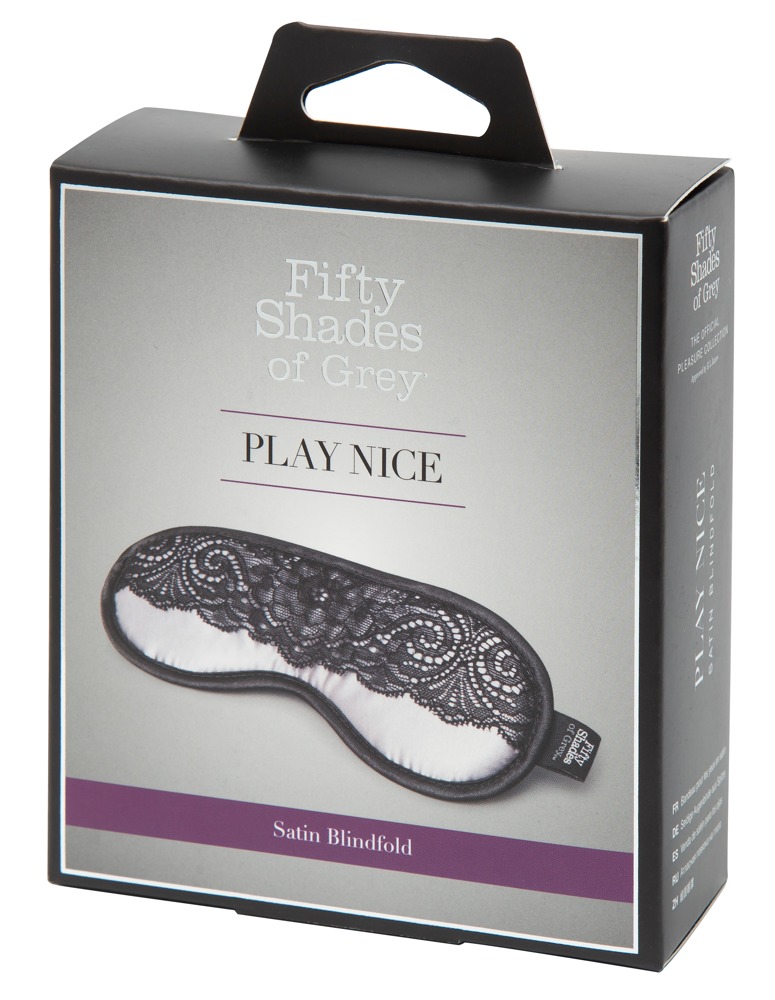 Elegant Play Nice Satin Blindfold øjenmaske fra Fifty Shades of Grey lavet af sølvfarvet satin med fine sorte øjenvippespidser. Helt uigennemsigtig og let polstret, samt med en bred elastisk hovedbøjle for maksimal komfort under leg og søvn.