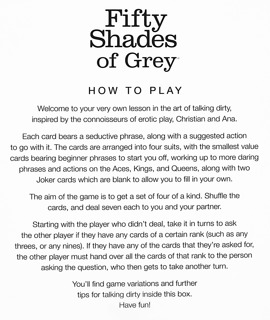 Dette Play Nice Talk Dirty Inspirationskort fra Fifty Shades of Grey i et stilfuldt look er den perfekte inspiration til beskidt snak, rollespil og spændende handlinger! Hvert af de 52 spillekort har et citat fra Fifty Shades-trilogien, et forførende ordsprog og en matchende handling. Opdelt i 4 farver fra begyndervenlige til mere vovede ord og handlinger. For at opnå en ekstra speciel action kan jokerne også trækkes ud for at gennemføre dine egne idéer.