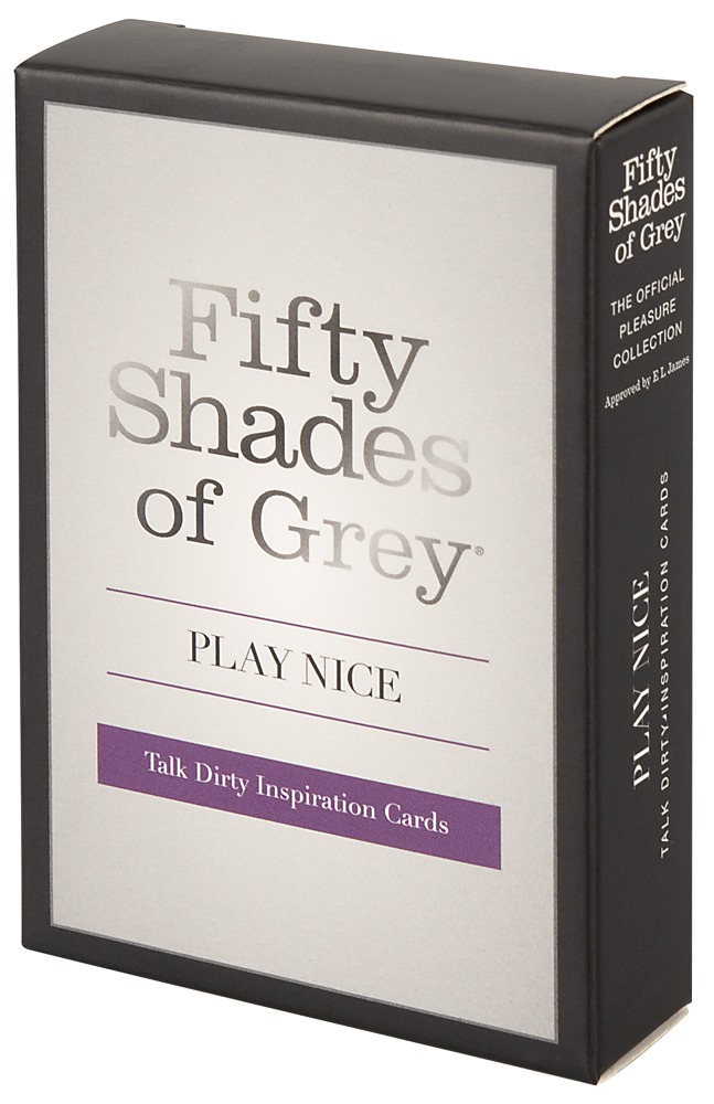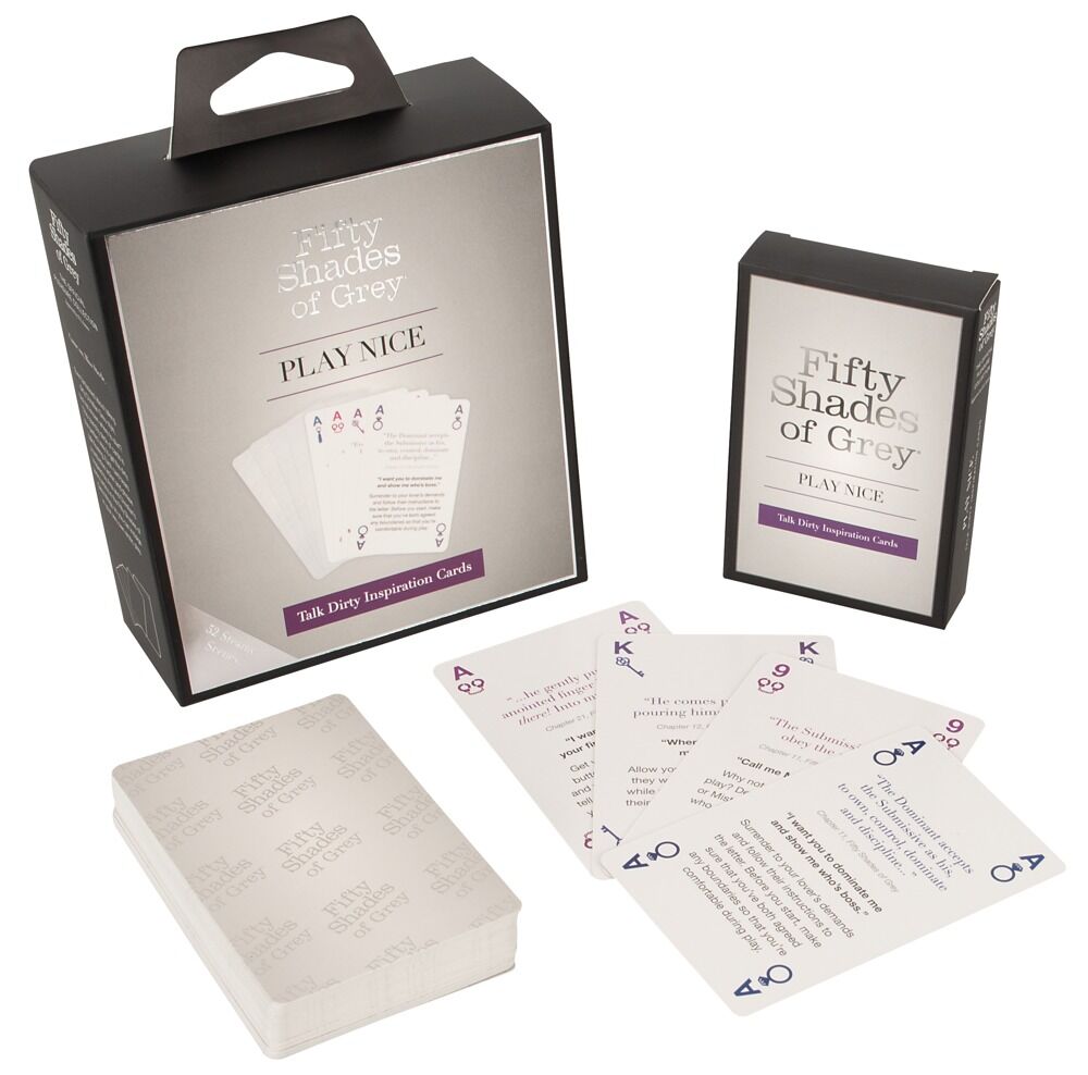 Denna kortlek Play Nice Talk Dirty Inspiration Cards från Fifty Shades of Grey i ädelt utseende är den perfekta inspirationen för dirty talk, rollekar och spännande lekar! Alla 52 kort har citat från Fifty Shades-trilogin, fräcka ord och en passande lek. Uppdelat i 4 färger från nybörjarvänligt till mer vågade ord och handlingar. För lite speciell action kan även jokern användas för att realisera egna idéer.