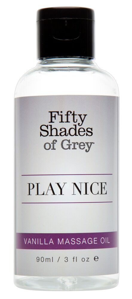 Lyxiga Play Nice Vanilla Massage Oil från Fifty Shades of Grey med sensuell vaniljdoft som väcker och intensiverar sinne och stämning! Perfekt för en spännande partnermassage och långa förspel. 90 ml.