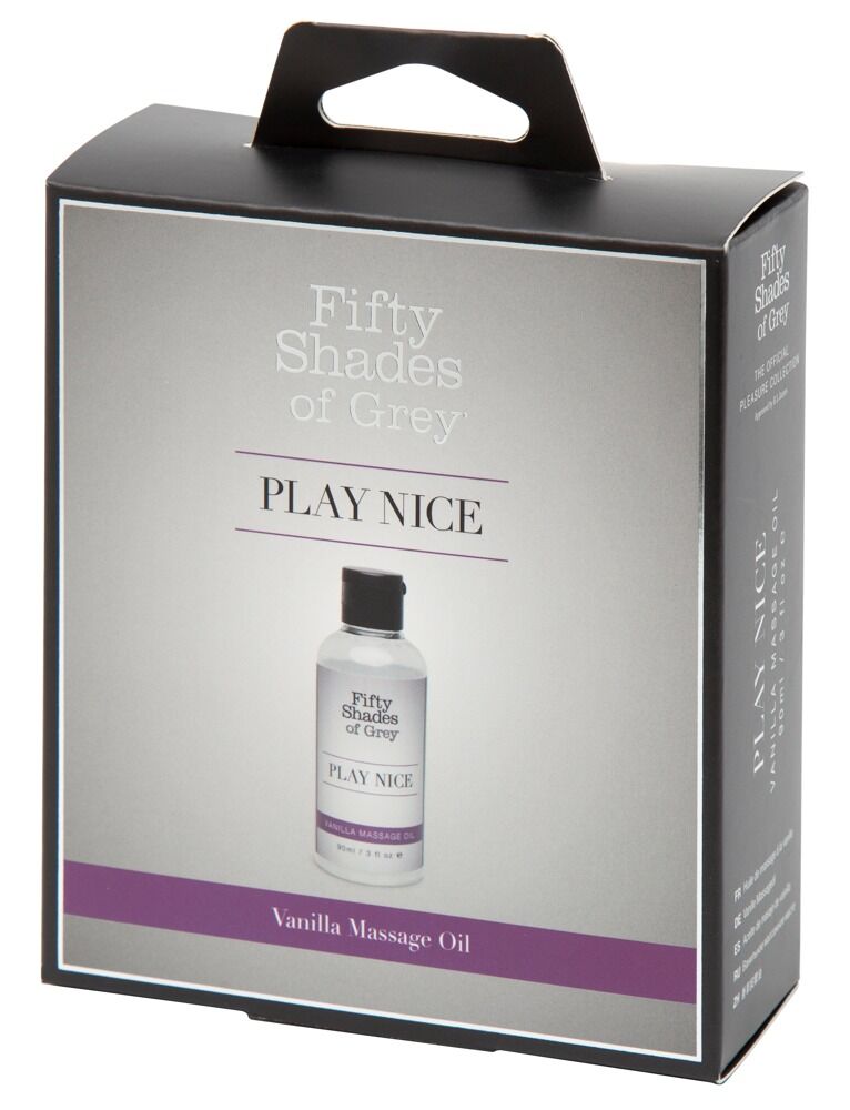 Huile de massage Play Nice Vanilla de haute qualité de Fifty Shades of Grey avec un parfum sensuel de vanille qui éveille et intensifie les sens et l'humeur ! Parfait pour un massage de partenaire explorateur et des préliminaires prolongés. 90 ml.