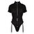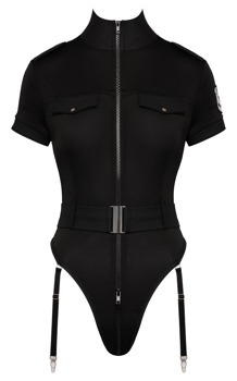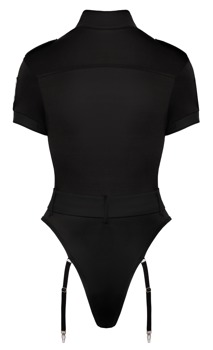 Svart body med strømpestropper fra Cottelli COSTUMES i spesialpoliti-stil med kult emblem på venstre arm. Mykt, ettersittende stretchstoff kombinert med matt glinsende wetlook.