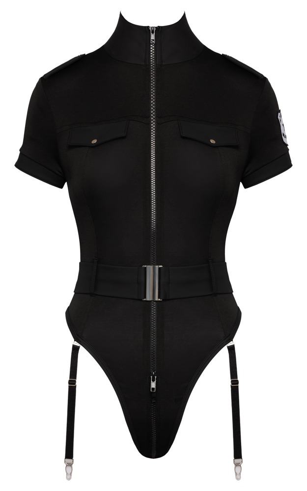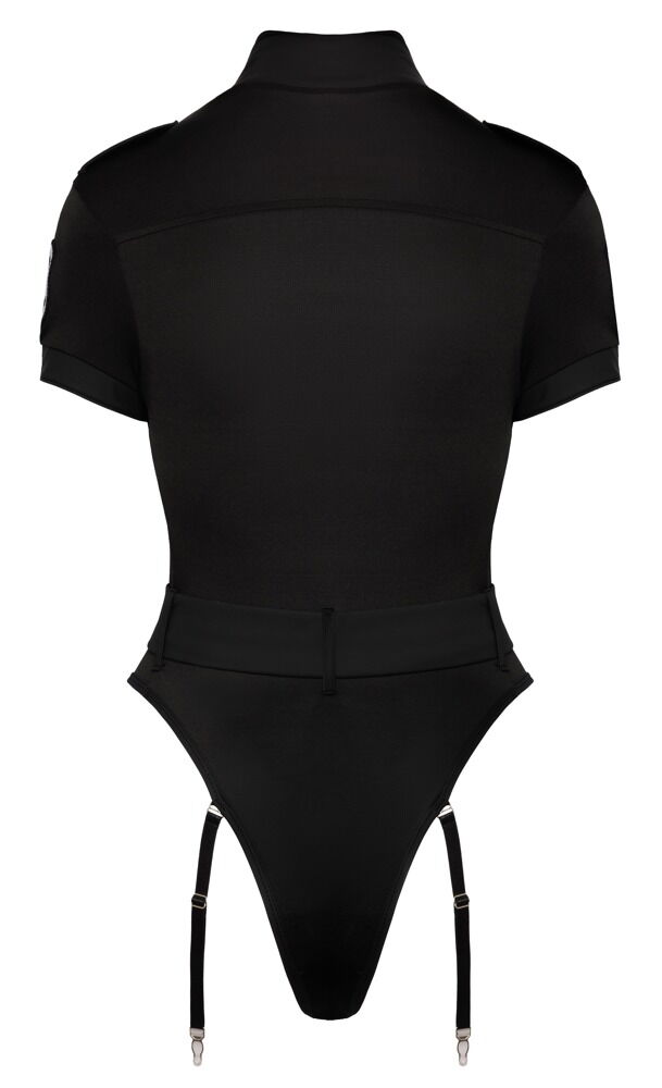 Sort body med seler fra Cottelli COSTUMES i specialpolitistil med iøjnefaldende emblem på venstre arm. Blødt, vamset stretchmateriale blandet med mat, skinnende wetlook. Højhalset og med halv arm, samt skulder- og brystflapper for det typiske politilook. Også med løkker til det medfølgende stretchbælte med smukt sølvfarvet spænde. Den gennemgående 3-vejs lynlås går fra den høje ståkrave ned til skridtet. Selerne er justerbare og kan også tages helt af kroppen.