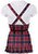 Ta sukienka to idealny mundurek szkolny. Na wierzchu w postaci białej bluzki z krótkim rękawem, kołnierzykiem i niskim dekoltem oraz z naszytą częścią spódnicową w niebiesko-czerwoną kratę, której naszyte ramiączka sięgają ponad biust i krzyżują się na plecach. Z krótką plisowaną spódniczką i dwoma białymi szelkami z przodu.