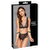 Ensemble noir de Cottelli BONDAGE avec soutien-gorge souple, slip taille ouverte et deux menottes douces. Powernet doux et élastique avec des détails mattlook en optique bondage et des accessoires argentés. Soutien-gorge profondément échancré avec chaîne-bijou amovible dans le décolleté. À l'avant, sur la sangle sous la poitrine, un anneau de fixation. Les doubles bretelles raffinées sont réglables. Tout comme la fermeture à crochets dans le dos. Slip coupé à la taille avec chaîne stimulante amovible à l'entrejambe ouvert. Les lanières latérales en stretch sont réglables. À l'arrière de la ceinture et sur chaque côté, un anneau dans lequel les attaches peuvent être accrochées avec leurs chaînes à mousquetons. Les poignets souples s'enfilent et s'enlèvent rapidement grâce à leurs fermetures velcro réglables.