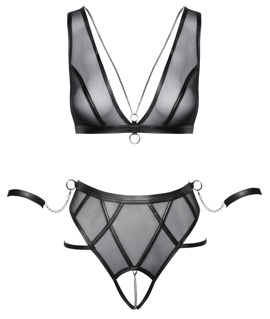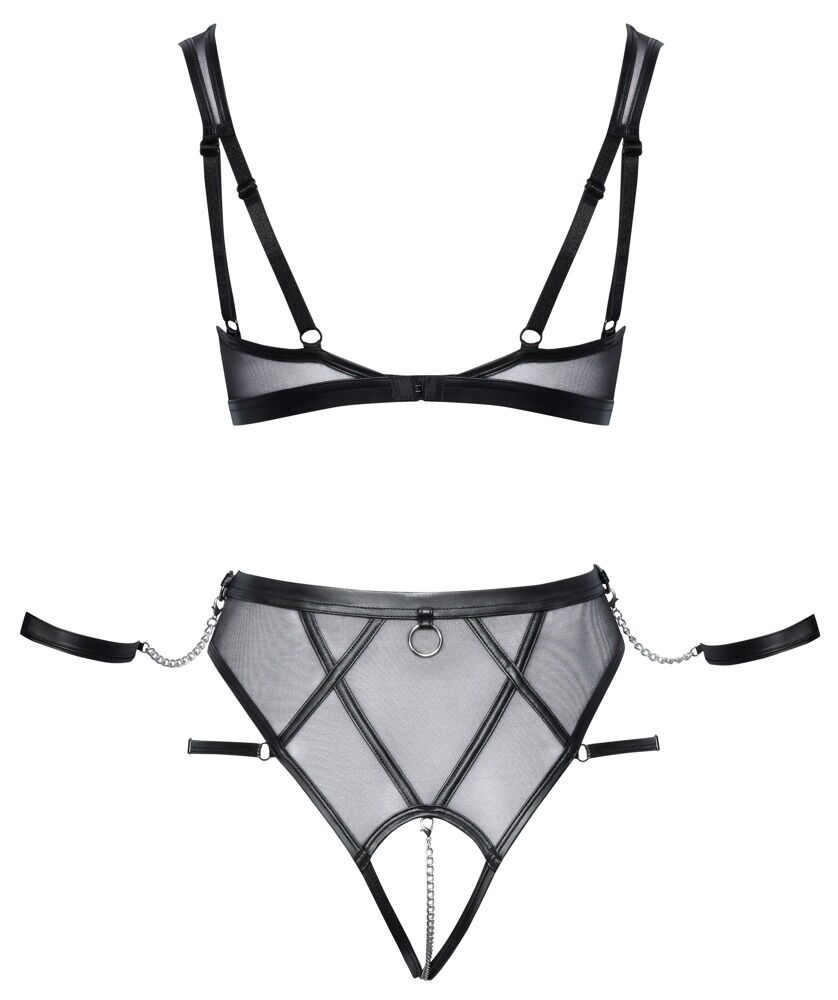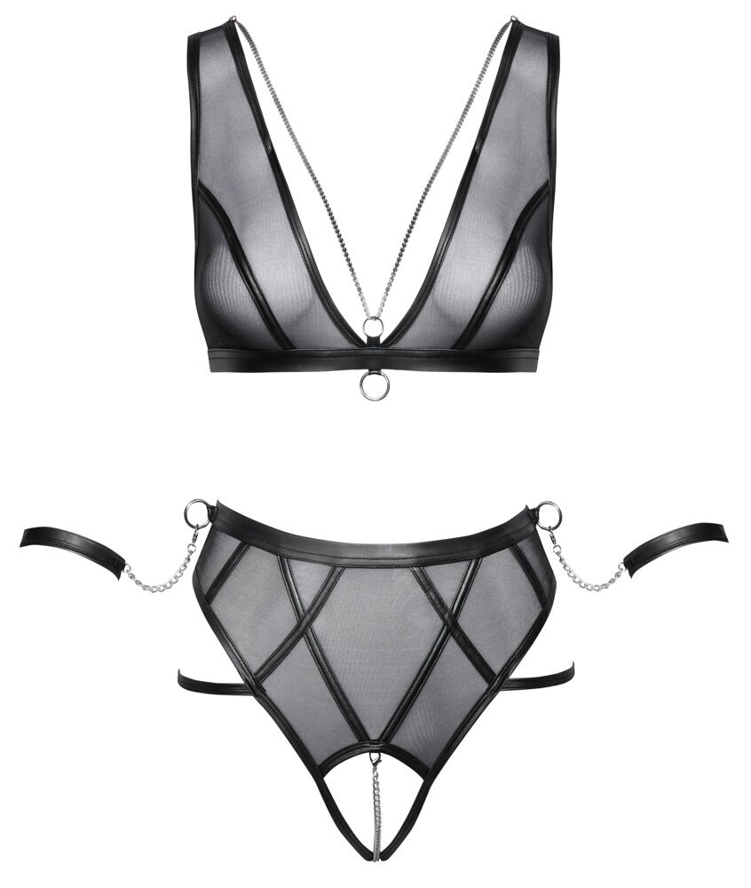 Czarny zestaw Cottelli BONDAGE z miękkim biustonoszem, majtkami bez krocza i dwoma miękkimi kajdankami. Miękki, elastyczny powernet z matowymi detalami w stylu bondage i srebrnymi dodatkami. Nisko wycięty biustonosz z odpinanym biżuteryjnym łańcuszkiem w okolicy dekoltu. Pasek pod biustem z pierścieniem na kostkę z przodu. Wyrafinowane podwójne ramiączka można dopasować. Podobnie jak zapięcie na haftki z tyłu. Majtki z wysokim stanem i odpinanym, stymulującym łańcuszkiem w kroku. Elastyczne paski po bokach można dopasować. Z tyłu pasa i z każdej strony znajduje się pierścień, do którego można zaczepić mankiety na kostki za pomocą łańcuszków z karabińczykami. Miękkie mankiety na kostki można szybko założyć i zdjąć dzięki regulowanym zapięciom na rzepy.