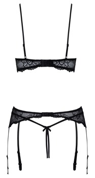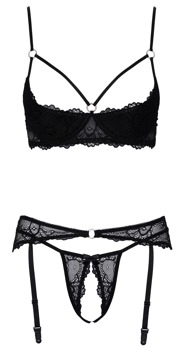 BH, höfthållare och öppen string i ett set från Cottelli LINGERIE. Allt av mjuk, svart stretchspets. BH´n och höfthållaren har glittrande pyntringar. Den lätt vadderade, öppna BH´n presenterar brösten på bästa sätt, de elastiska kupremmarna och byglarna ramar in och stöttar. Axelbanden och hakknäppningen baktill kan justeras. Smal höfthållare med 6 justerbara strumphållare och hakknäppning baktill. Den lilla spetsstringen förför med en öppen gren.