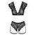 Charmant top och snygg öppen trosa i ett svart spetsset från Cottelli LINGERIE. Båda delar av mjuk, elastisk blomsterspets för maximal komfort. Toppen har kort ärm och djup urringning både framtill och baktill. Strassring framtill. Baktill med justerbar stretchrem och hakknäppning så att allt sitter som det ska. Högt skuren trosa med justerbara lårremmar. Trosan är öppen i grenen.