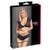 Charmerende top og sofistikerede skridtfrie trusser i et sort blondesæt fra Cottelli LINGERIE. Begge dele er lavet af bløde, elastiske blomsterblonder for maksimal komfort. Top med korte ærmer og en dyb udskæring foran og bagpå. Dekoreret med en rhinstenring foran. Udskæringen bagpå har justerbare stropper med stretch, så intet glider. Ekstra hægtelukning. Højtskårne trusser med justerbare lårstropper. Forførende åben i skridtet.